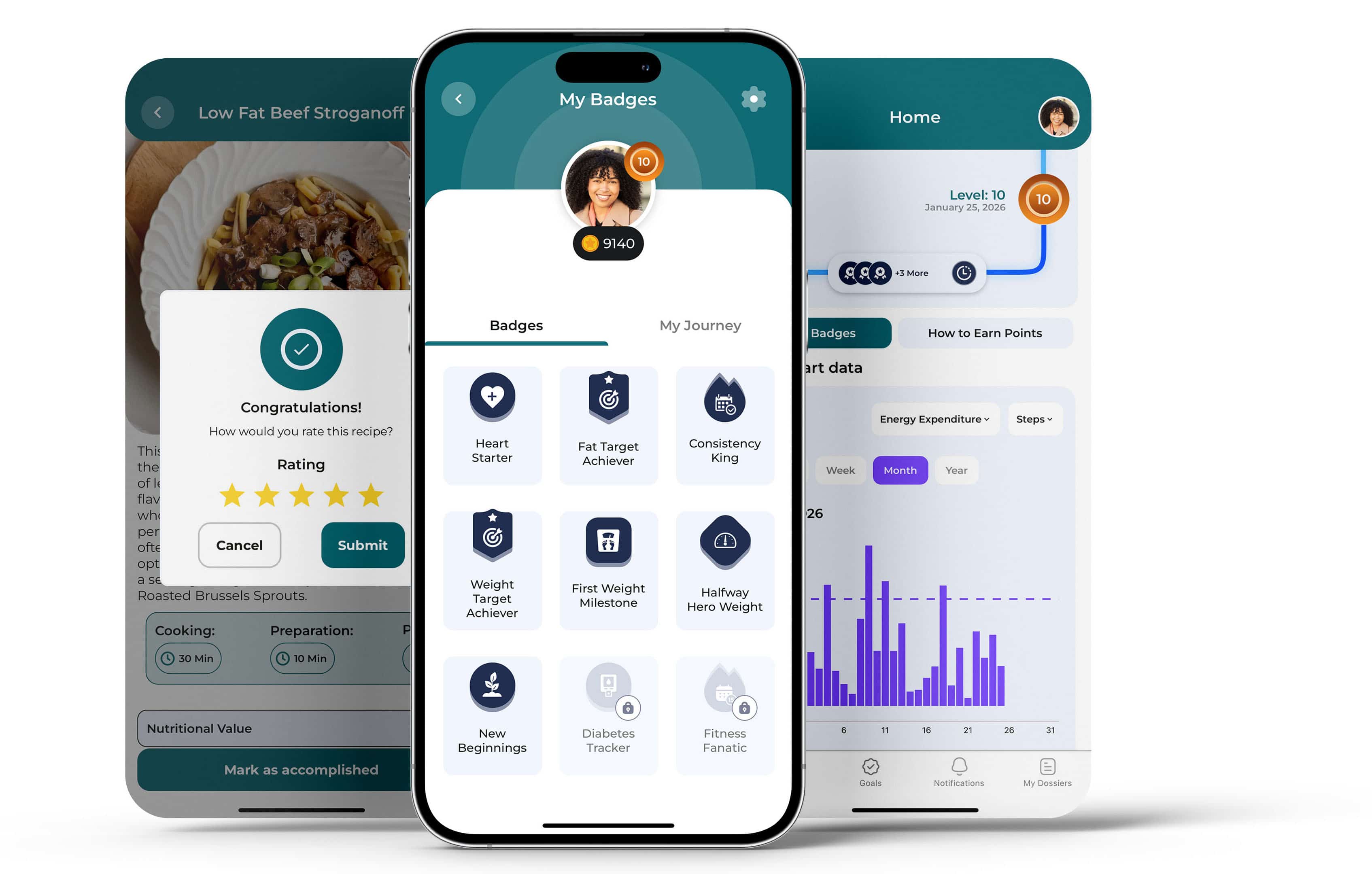 The path to health should be fun and rewarding. Each milestone brings you closer to tangible rewards: medals, lifestyle points, and levels to climb. These playful elements keep you connected to your goals and turn your challenges into tangible successes.