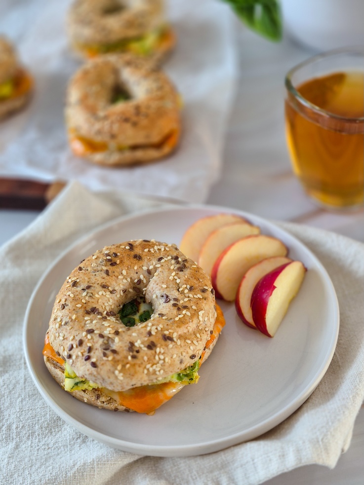 These breakfast bagels are perfect for busy mornings or for meal prep ahead of time. They offer a high protein content thanks to the fluffy cottage cheese and vegetable omelette, which helps promote satiety and sustained energy. They reheat easily and make a practical, balanced, and satisfying breakfast. An option approved by our dietitians! For even more inspiration, discover our 10 quick and nourishing breakfasts.