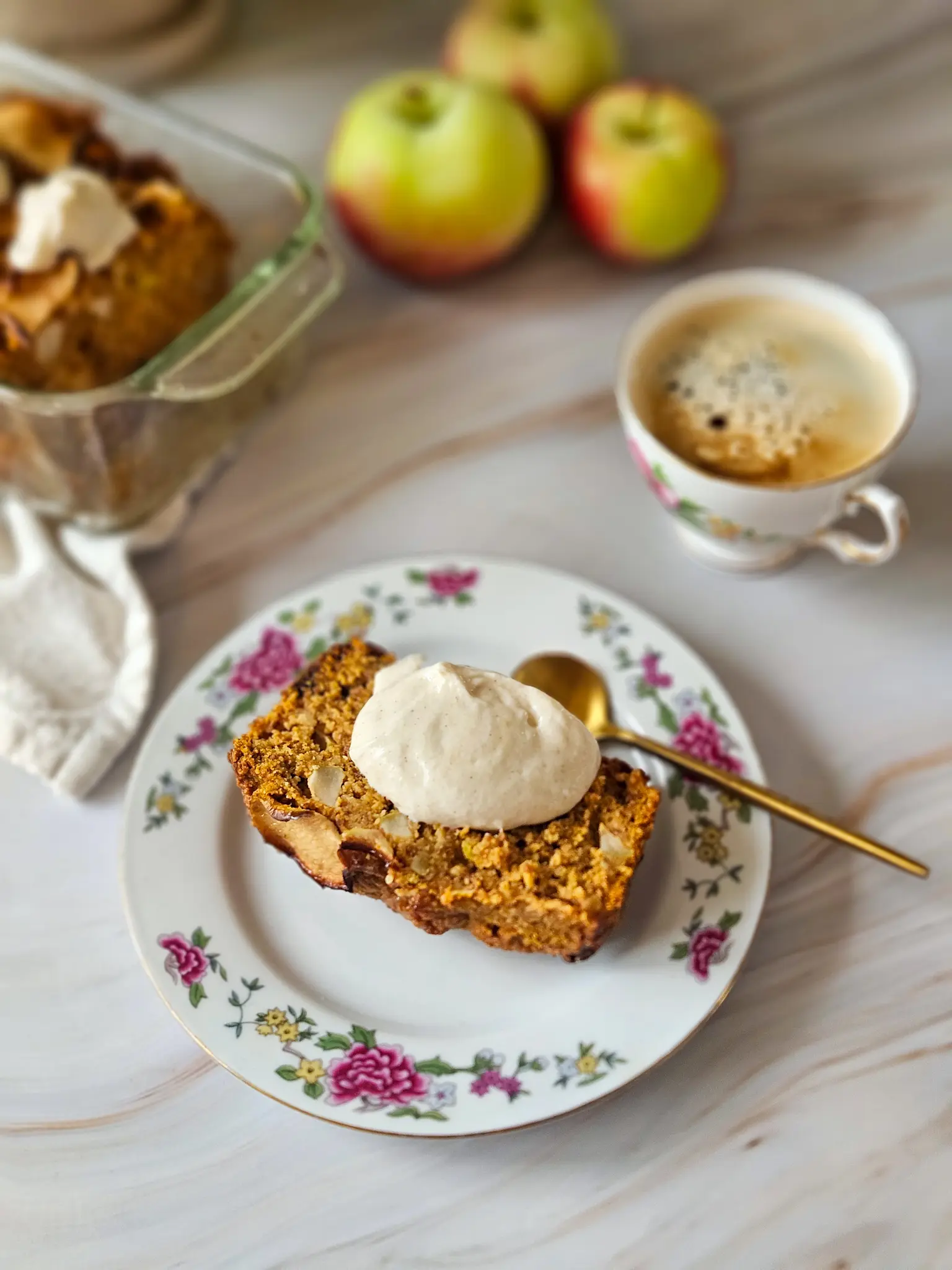 - In a small bowl, combine the Greek yogurt, applesauce, and cinnamon. Serve with the loaf.
