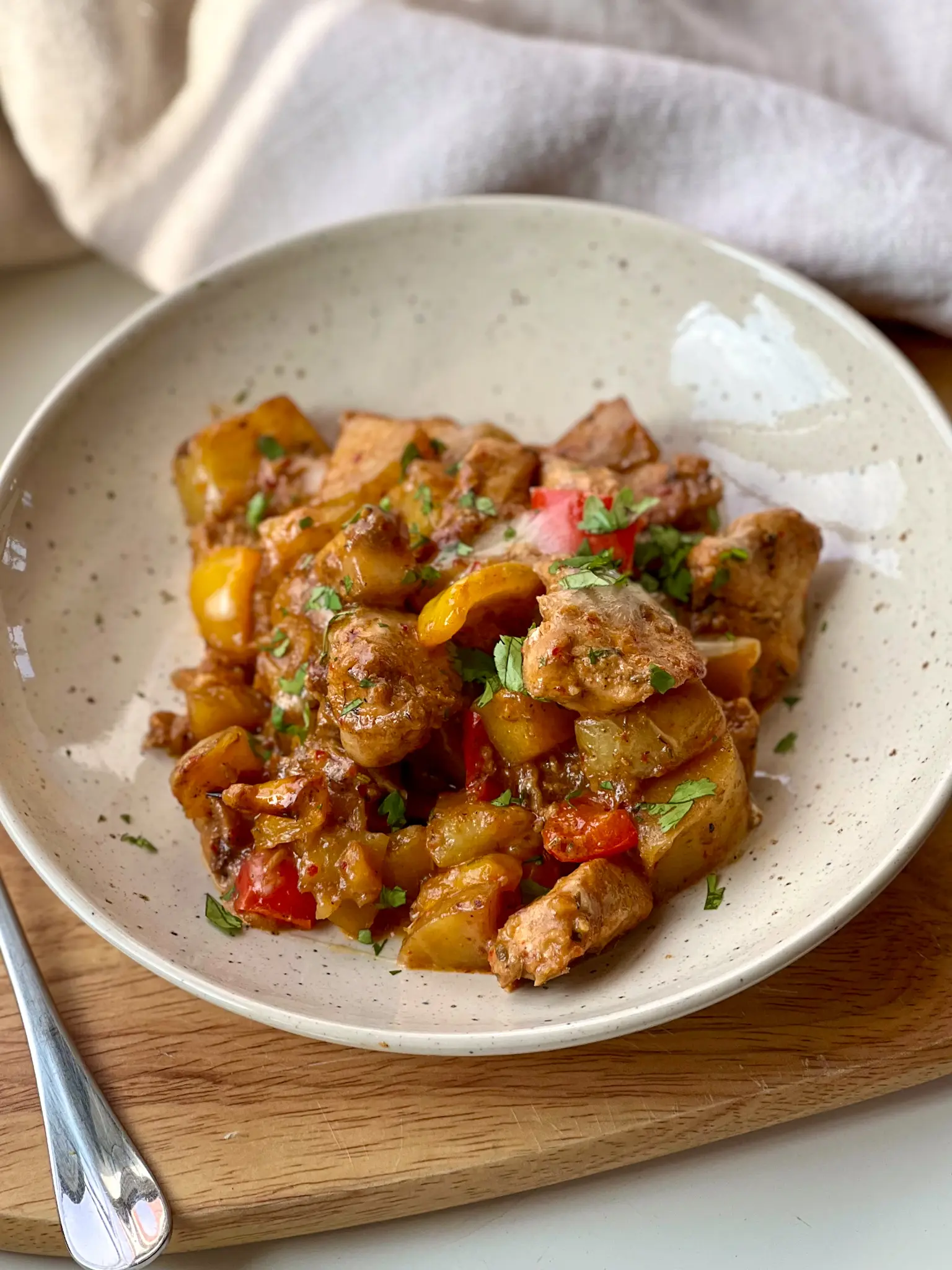 - 3 medium (~ 600 g) chicken breasts, cubed