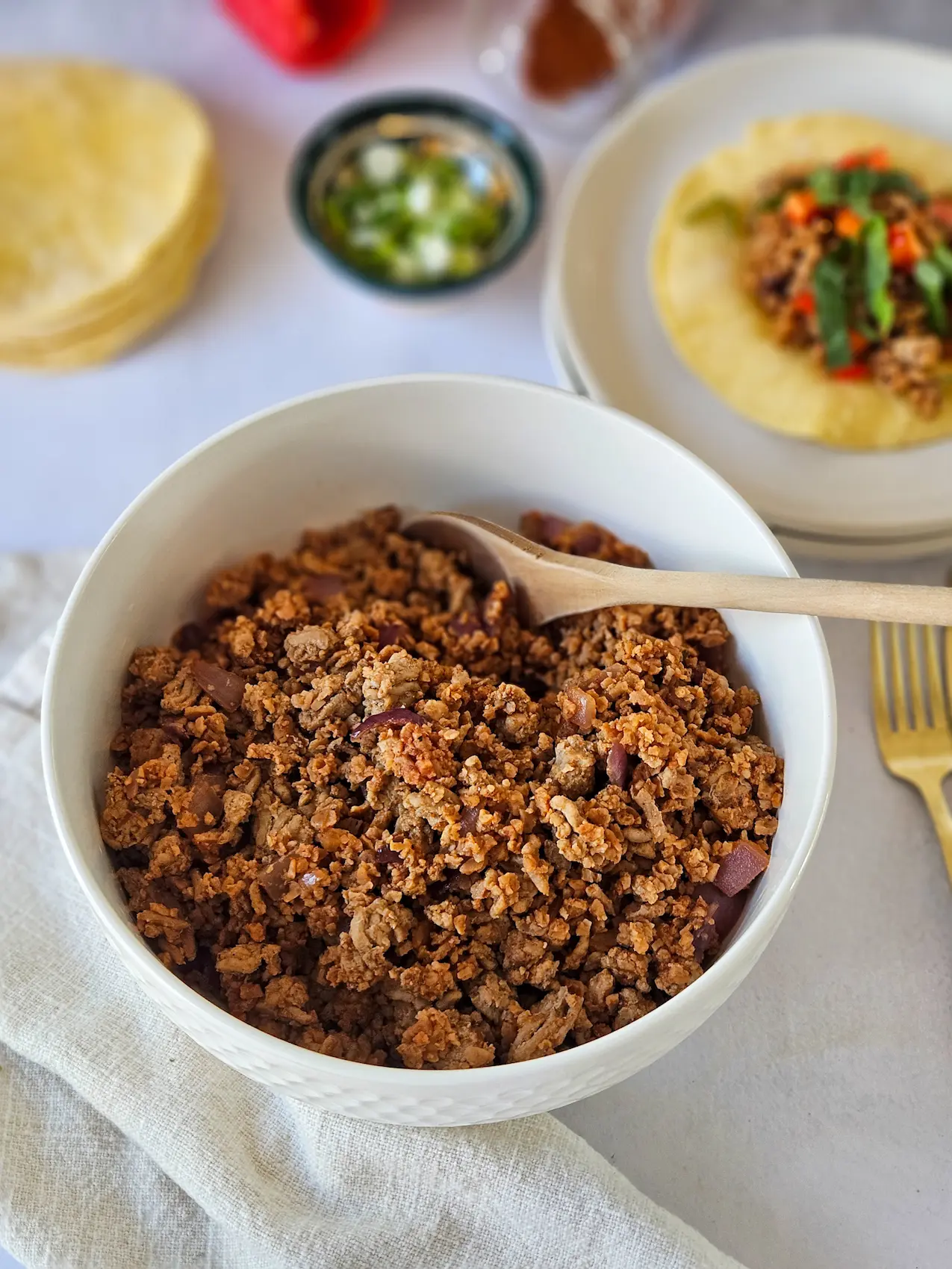 Created by a dietitian, this half-meat, half-TVP (textured vegetable protein) mix is a simple way to boost your fibre intake while reducing meat consumption. Perfect for weeknight dinners or lunches served taco-style, or as a topping for salads, nachos, or burritos! It freezes well and makes for a high-protein meal ready in minutes on hectic evenings.