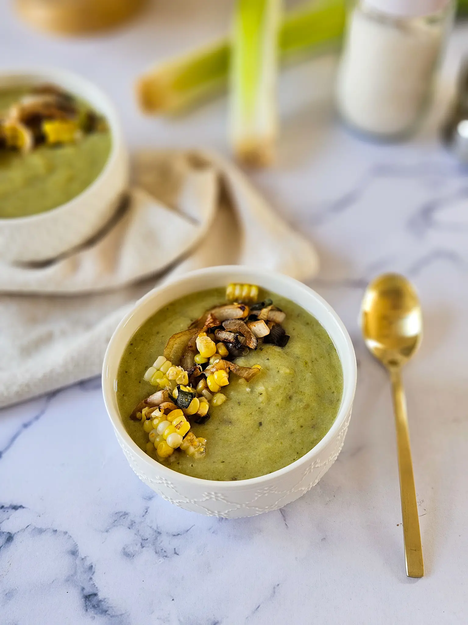 Comforting and nutritious, this leek soup, created by a dietitian, stands out with the addition of silken tofu—an excellent source of plant-based protein that gives it a creamy texture without the need for cream. Perfect for chilly days, it makes for a nourishing starter and freezes easily. Serve it with our Oven-Baked Veggie Platter for the perfect comforting combo.
