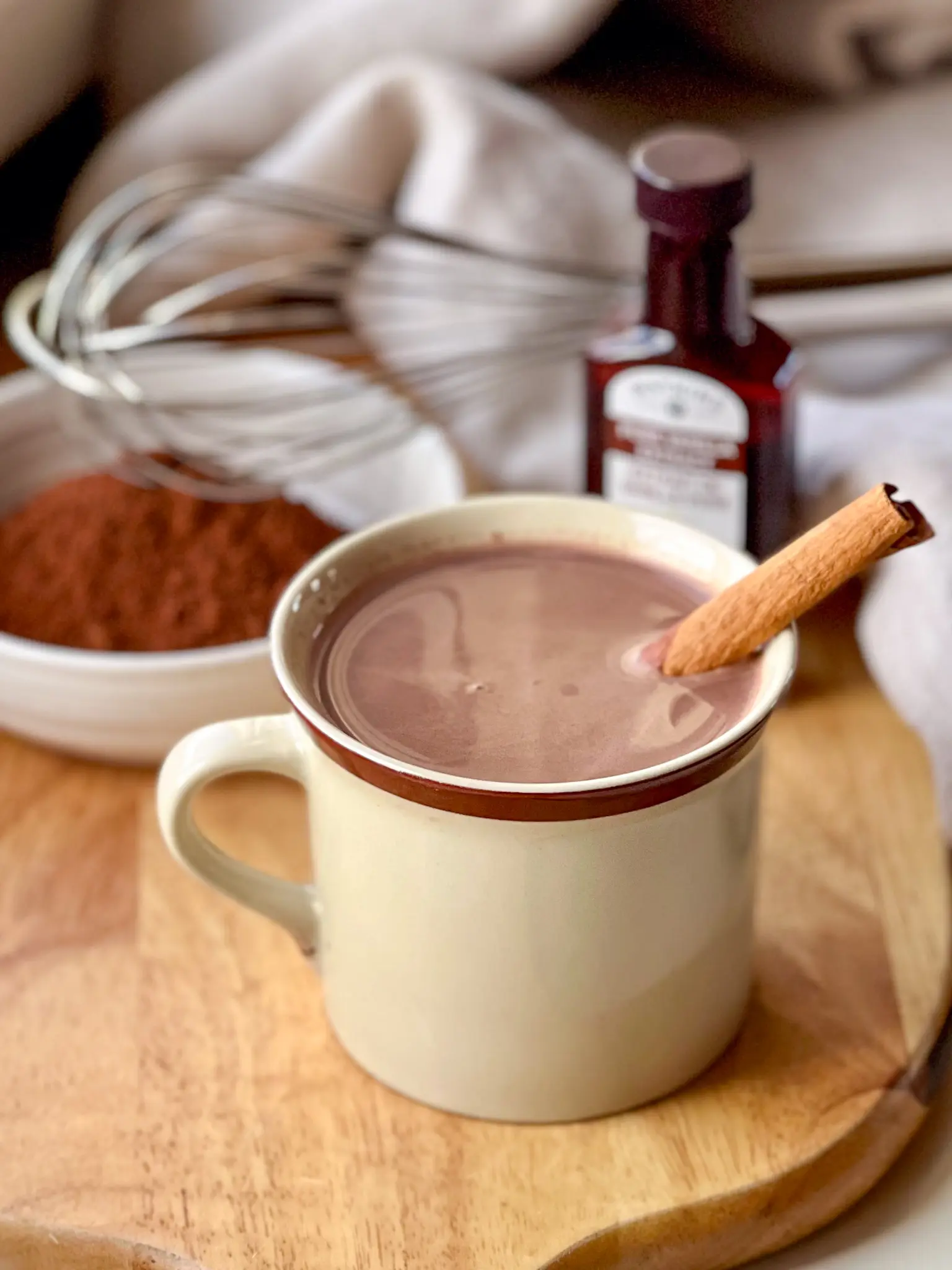 - Place the saucepan over medium heat and warm the mixture, stirring frequently, until hot but not boiling, about 3 to 5 minutes. Add cinnamon stick if desired.