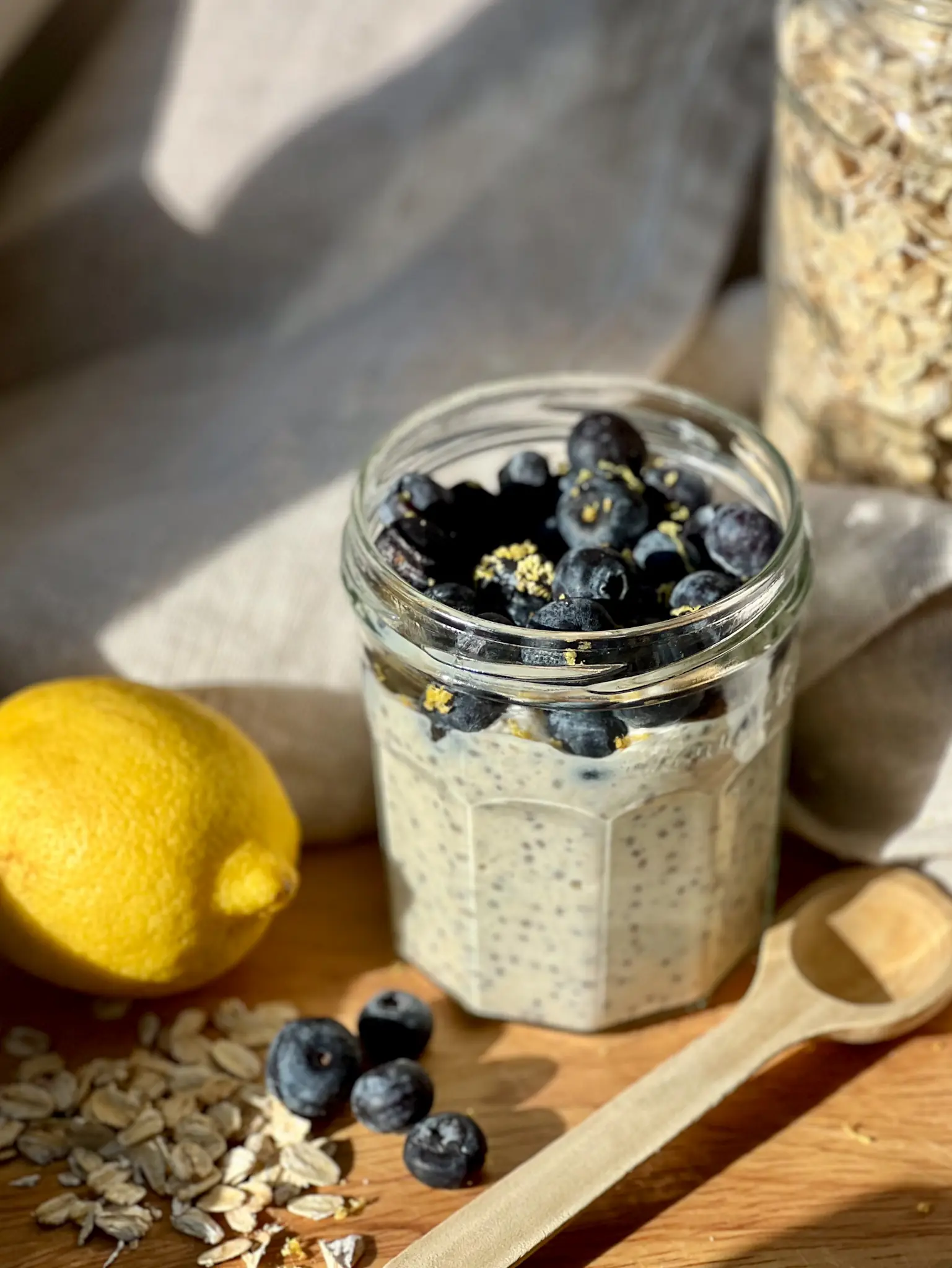 - In 2 mason jars or airtight containers, combine all the ingredients except blueberries and lemon zest.