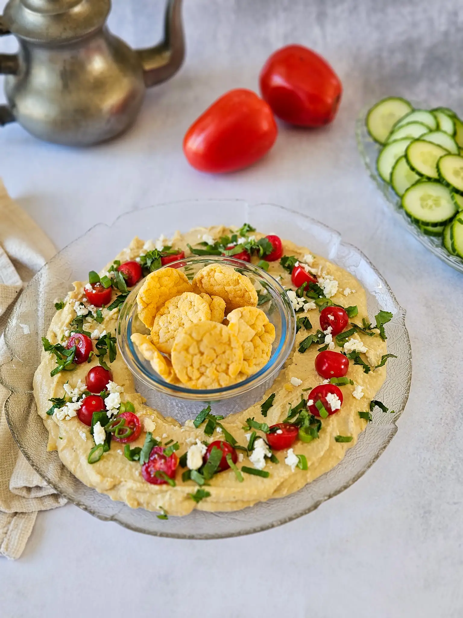 - On a large serving plate, spread the hummus into a ring shape about 3 to 4 cm thick.