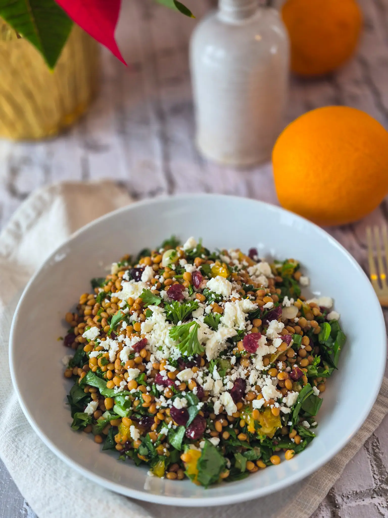 - In a large bowl, combine the lentils, orange supremes, shallot, spinach, cranberries, feta cheese, and parsley.