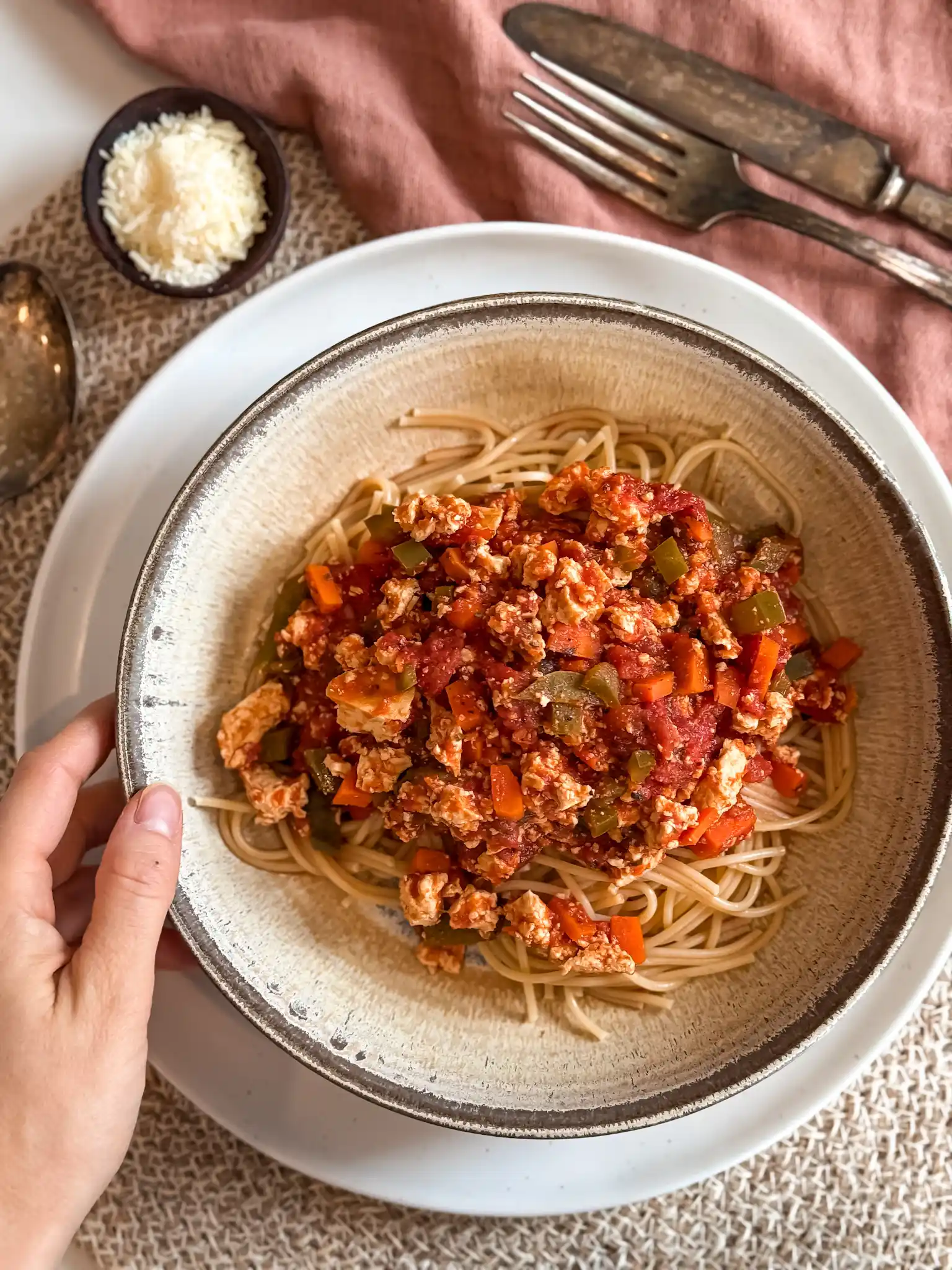 - 1 block of 454 g (1 lb) extra-firm tofu, crumbled (or ½ lb (225 g) raw ground turkey)