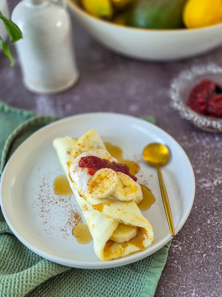This flourless and dairy-free protein crêpe is high in protein and surprisingly filling. Its combination of ingredients may seem unusual, but wait until you’ve tried it before judging: it’s delicious. The peanut butter and jam duo brings back a comforting classic, in a more nutritious version. Our dietitians recommend it as a post-workout snack or to curb an afternoon craving.