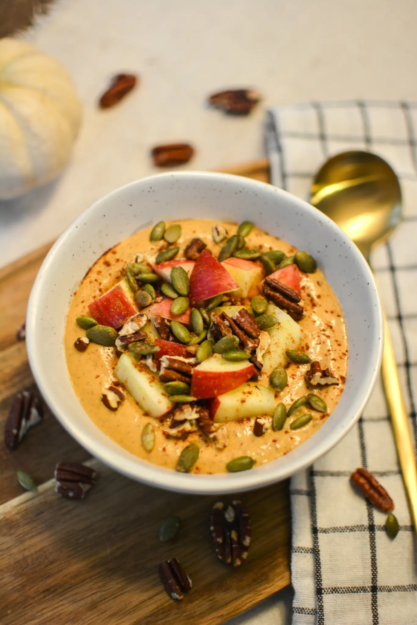 - Pour the mixture into a bowl and top with apples, pumpkin seeds, and pecans.