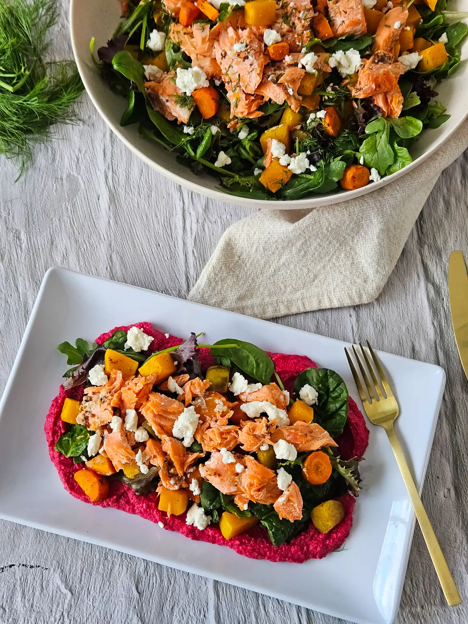 With January around the corner, resolution season is in full swing! If you're looking to eat better this new year, this nourishing power salad, approved by our registered nutritionists-dietitians, is a perfect choice. Featuring salmon and fibre-rich roasted vegetables, it’s a balanced, comforting, and colourful meal. An ideal option to brighten up your weekday lunches.