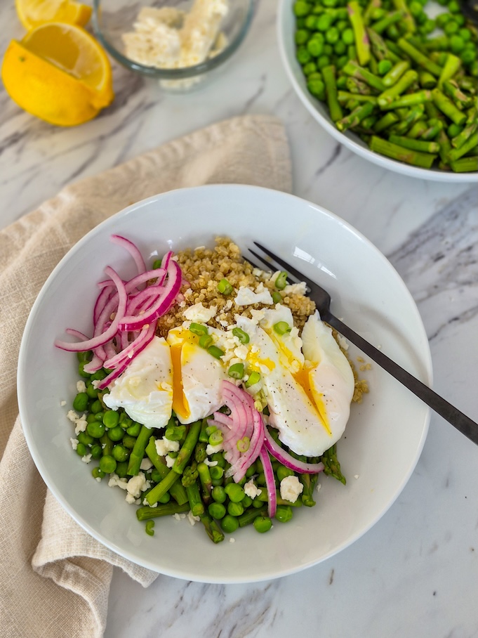 - Divide the quinoa between two bowls. Top with the green vegetables and pickled red onion. Drizzle with the lemon dressing. Place two poached eggs on each portion. Sprinkle with feta cheese and fresh herbs.
