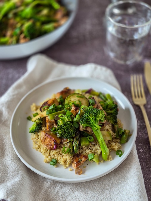 This spring stir-fry is a colorful meal rich in plant-based protein. The tofu marinated in maple syrup and soy sauce adds a sweet-and-salty touch that pairs perfectly with seasonal vegetables. Served over quinoa, this simple and nourishing recipe makes a complete meal that our dietitians like to recommend as a quick option for weeknight dinners.